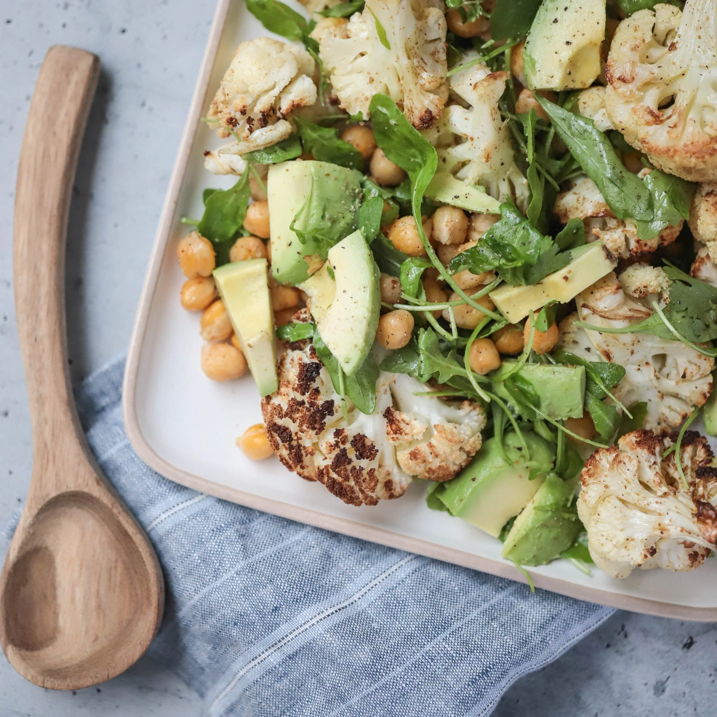 Der Salat vereint viele meiner Lieblingszutaten: gerösteten Blumenkohl, cremige Avocadostückchen und knackigen Rucola, dazu ein Dressing aus Zitronensaft und Tahini.
